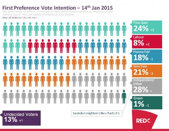 Lucinda Creighton’s party secures 1% of the first preference vote in the poll despite not yet having a party name, and when quizzed separately 6% suggest that that they may give them a first preference vote based on what they have heard so far.