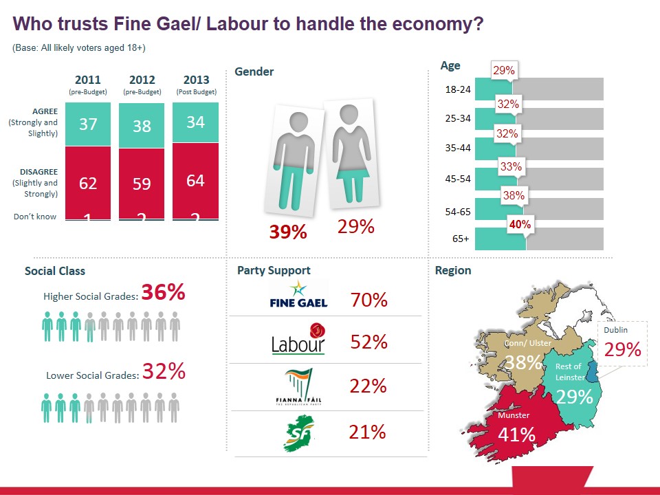 This year, despite some early signs of improvement in the economy and gains in consumer confidence; as yet the coalition do not appear to be reaping any rewards for this. In fact the proportion of voters that trust Fine Gael and Labour with the economy has declined in the past year. It currently stands at just over a third of voters (36%), down 2% from a year ago.