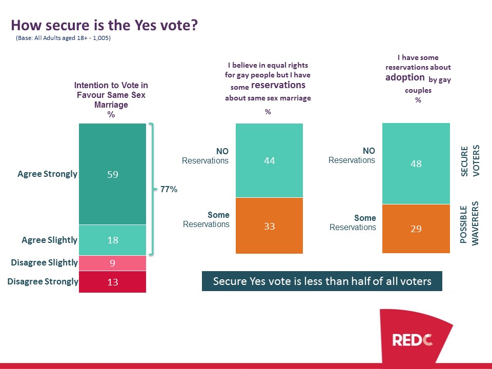 Despite a number of polls suggesting that voters will support the referendum for Same Sex Marriage equality, and the seemingly universal support for the measure among the political parties, there remains clear warning signs in our research once again this week that the referendum could still potentially be lost. The hard facts are that, once the various opinions of voters are analyzed, we can ascertain that at present less than half of the electorate is currently “certain” to support the referendum, without any reservations.