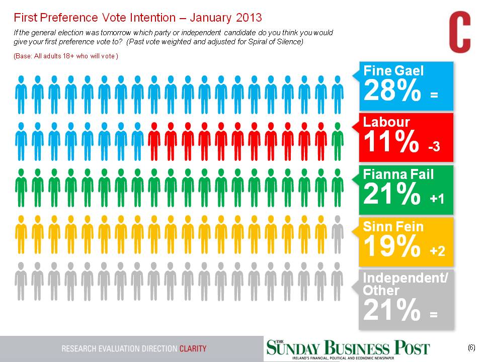 At first glance this may seem to be somewhat at odds with events over the last month as before the Budget, Labour appeared to have stabilised support at 14%. However, this stabilisation in support was helped by the fact that the poll was taken very soon after the recent debate on abortion in Ireland, brought about by the death of Savita Halappanavar. Labour is seen to be relatively aligned to the pro-choice side of the argument, and supporters also tend to be more pro-life in their outlook, as a result they received a lift on the back of the high profile nature of the debate.