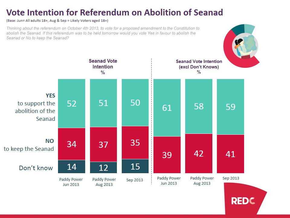 RED C first conducted a poll on the referendum back in June for bookmakers Paddy Power, and since then the general trend has been for the Yes vote in support of abolition to decline. This trend is typical in any recent referendum, where it is up to the supporters of change, to persuade voters that the result will be an improvement on the status quo. The problem for the government parties is that they could be in danger of losing this one. With three weeks to go, and no real debate as yet, only 50% of likely voters suggest they will vote Yes in favour of abolition. This is down slightly from June when 52% stated they would support the abolition, so as in past referendums the Yes vote is declining, even if only gradually.